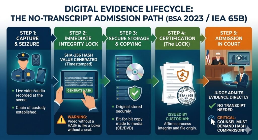 The Critical Warning: “The Certificate is the Lock, but the Hash is the Key.” Under Section 63 of the BSA (2023), the law now expects more than just a signature. If a lawyer today doesn’t demand a Hash Value (SHA-256) comparison, they are failing their client. A video without a Hash is like a locker without a seal; it’s “Admissible,” but its Integrity is a question mark.